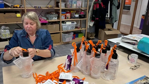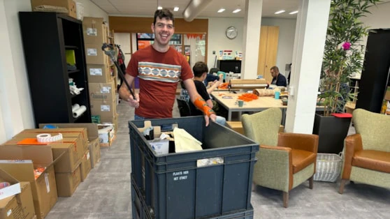 Er hangt een gezellige, ontspannen sfeer in hun eigen lokaal op de eerste verdieping. Het is pauzetijd en de begeleiders hebben een gezellige zithoek gecreëerd waar ze samen met de aanwezige assistent-medewerkers en een enthousiaste stagiaire van de opleiding MZ (Maatschappelijke Zorg) lunchen. Op het werkeiland in het midden van het lokaal is goed te zien dat er van alles wordt opgepakt: er staan half uitgepakte dozen, er ligt een berg oranje veters, er staan doorzichtige Rijn IJssel drinkflessen en er liggen kaartjes. Zorgbegeleider Bianca legt uit: De kaartjes worden met de oranje veters aan iedere waterfles geregen, in een plastic zakje gestopt en in een doos gepakt. Dit is bedoeld voor alle Rijn IJssel studenten die binnenkort gaan diplomeren. Iedereen heeft een eigen taak en zo heeft het team samen al honderden flessen gereedgemaakt.