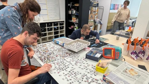 Aan het uiteinde van de tafel liggen er wel duizend puzzelstukjes verspreid en is assistent-medewerker Mike geconcentreerd bezig om de puzzel te leggen. Hopelijk klopt dit aantal precies, want dan is de puzzel compleet en kan deze ingepakt en verstuurd worden naar Rataplan of Speelstoet. Samen met assistent-medewerker Alexander heeft Mike al heel wat puzzels uitgezocht in de afgelopen maanden. Op de momenten dat er geen puzzelwerk voorhanden is, loopt Mike met een grijper en een grote mobiele afvalbak de hele school door om afval op te ruimen. Hij liep voorheen vooral met een rollator, maar op Kronenburg beweegt hij zoveel en krijgt hij de juiste stimulans, dat hij nu zelfs zonder hulpmiddelen kan lopen.