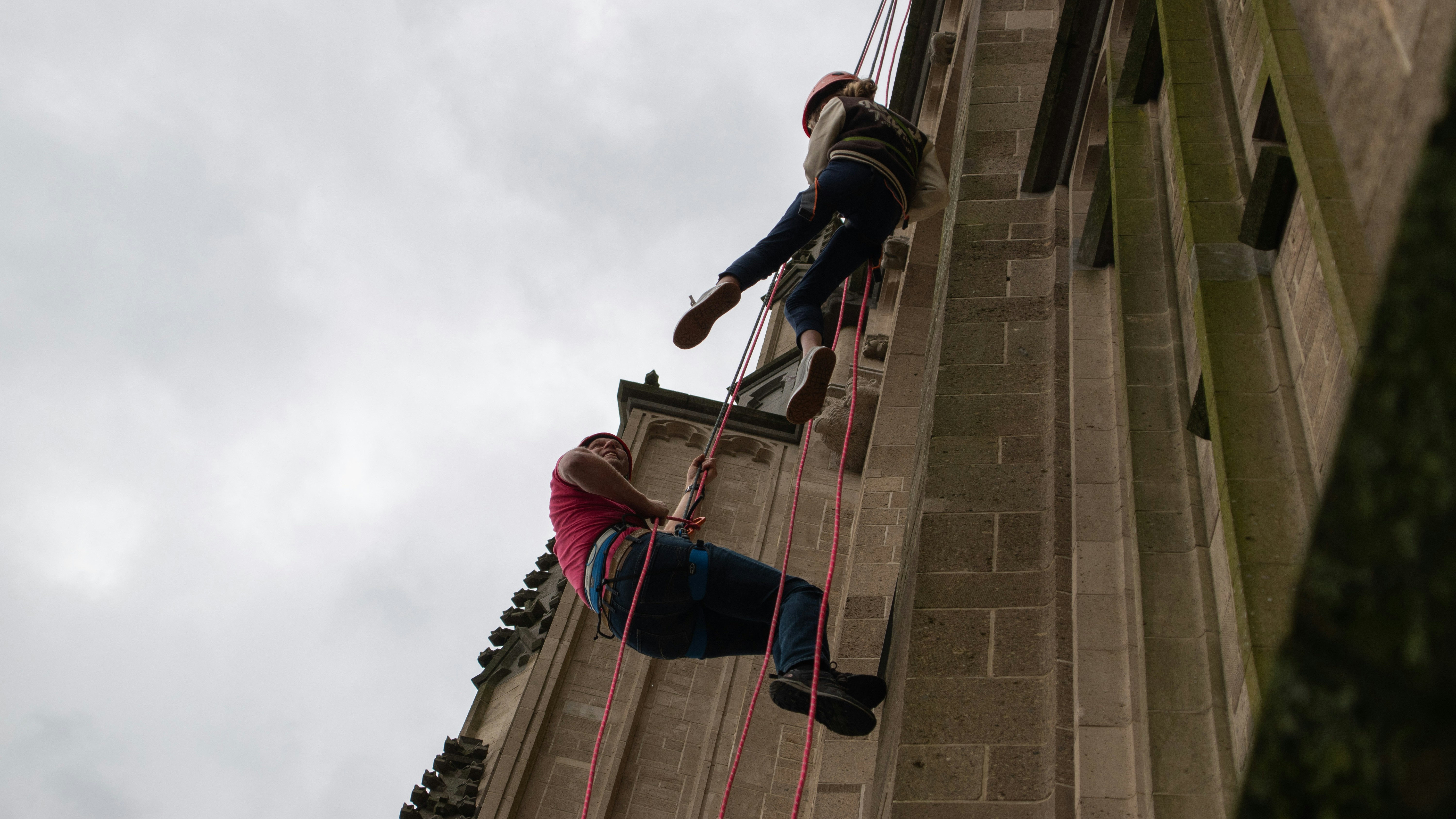 Naast studenten en medewerkers, gaan ook drie kinderen met een spierziekte langs de bekende kerk naar beneden. Ze dalen in totaal zo'n dertig meter af. De twaalfjarige Eline vertelt na afloop: Ik vond het superleuk, en ik heb gelukkig geen last van hoogtevrees. Zolang ik maar vast zit!